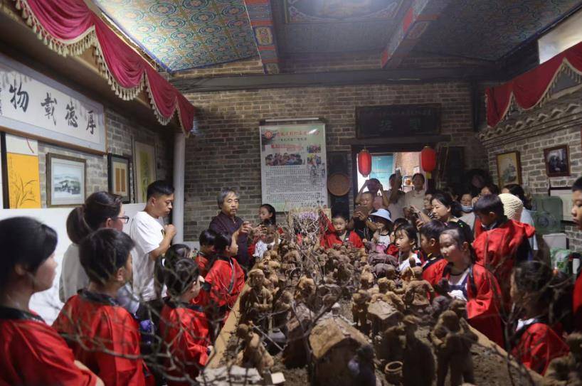 非遗工坊内,研学孩子围聚作品前,聆听讲解。